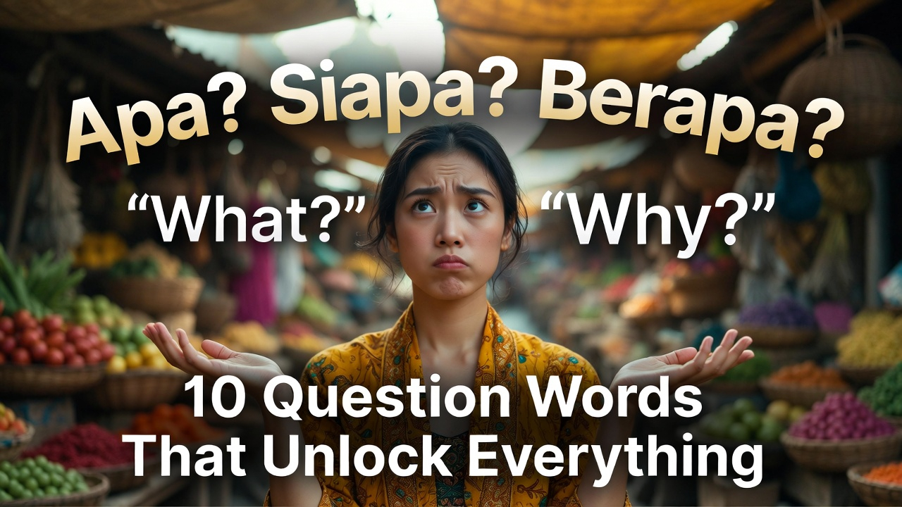 Master the 10 essential Indonesian question words -- apa, siapa, di mana, kapan, berapa, kenapa, bagaimana, yang mana, b...