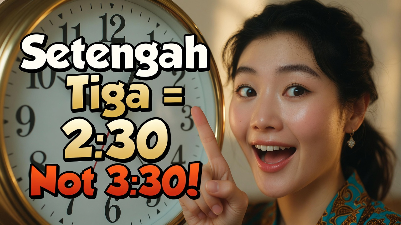 Indonesian time-telling has a tricky twist: 'setengah tiga' means 2:30, not 3:30. Learn the full system.